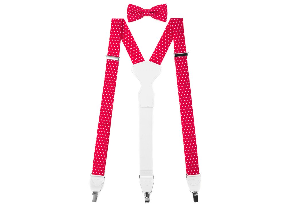 Červená pánská sada s bílými puntíky - bílý střed obsahuje pánské kšandy/šle, pánský motýlek a kapesníček do saka.