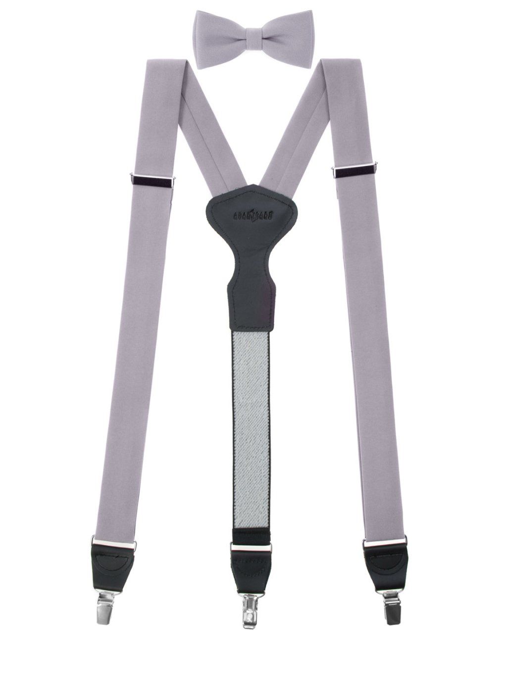 Šedá pánská sada obsahuje pánské kšandy/šle, pánský motýlek a kapesníček do saka.