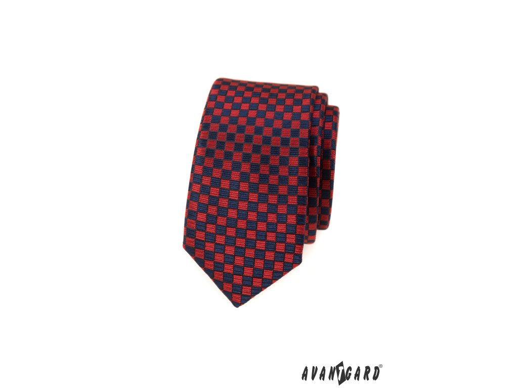 Červená pánská slim kravata s modrým vzorem šachovnice