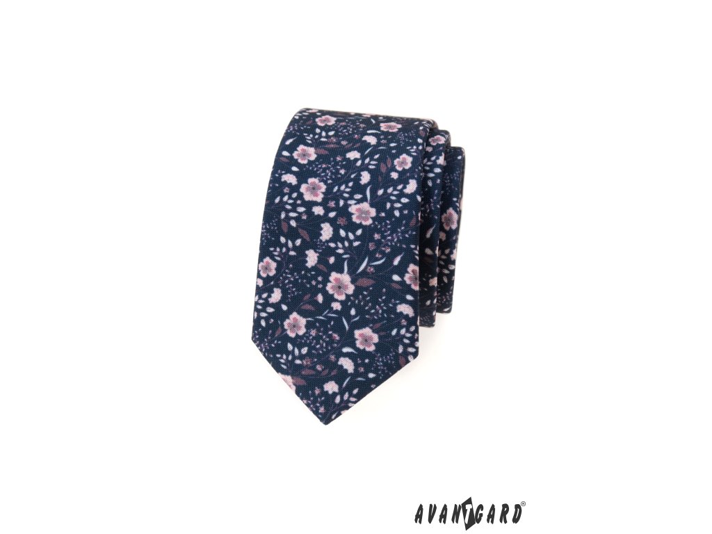 Modrá slim kravata s pudrovými květy