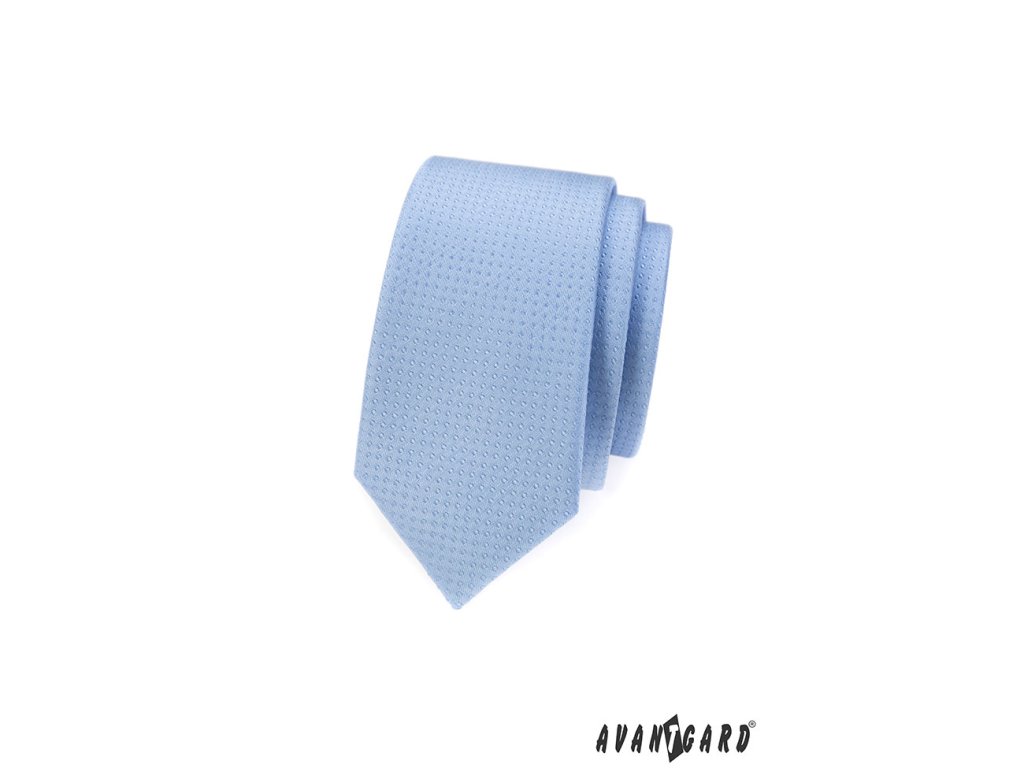Světle modrá slim kravata s tečkami stejné barvy je výrobek české značky Avantgard.