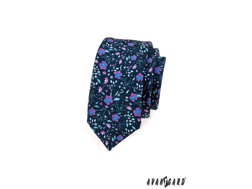 Tmavě modrá slim kravata s růžovým květinovým vzorem je výrobek české značky Avantgard.