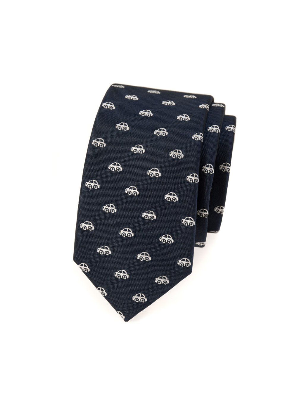 Tmavě modrá slim kravata se vzorem - auto je výrobek české značky Avantgard.