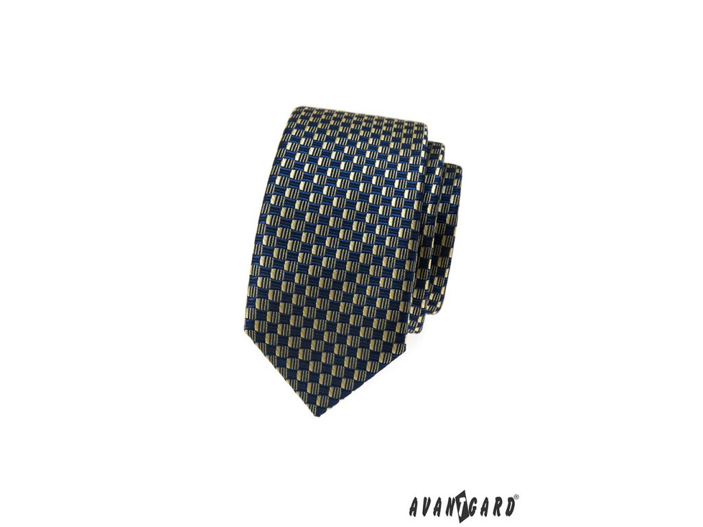 Tmavě modrá slim kravata se zlatým vzorem je výrobek české značky Avantgard.
