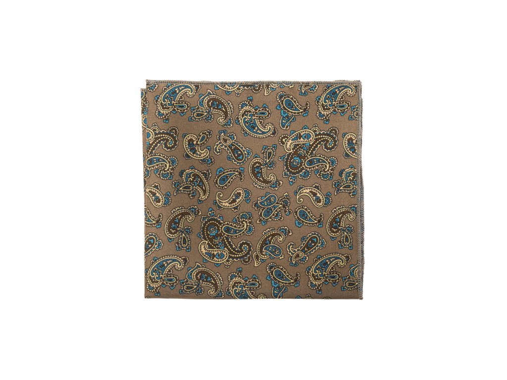 Béžový hedvábný kapesníček do saka – vzor Paisley je vyroben ze 100% hedvábí a jeho rozměry jsou 26x26 cm.