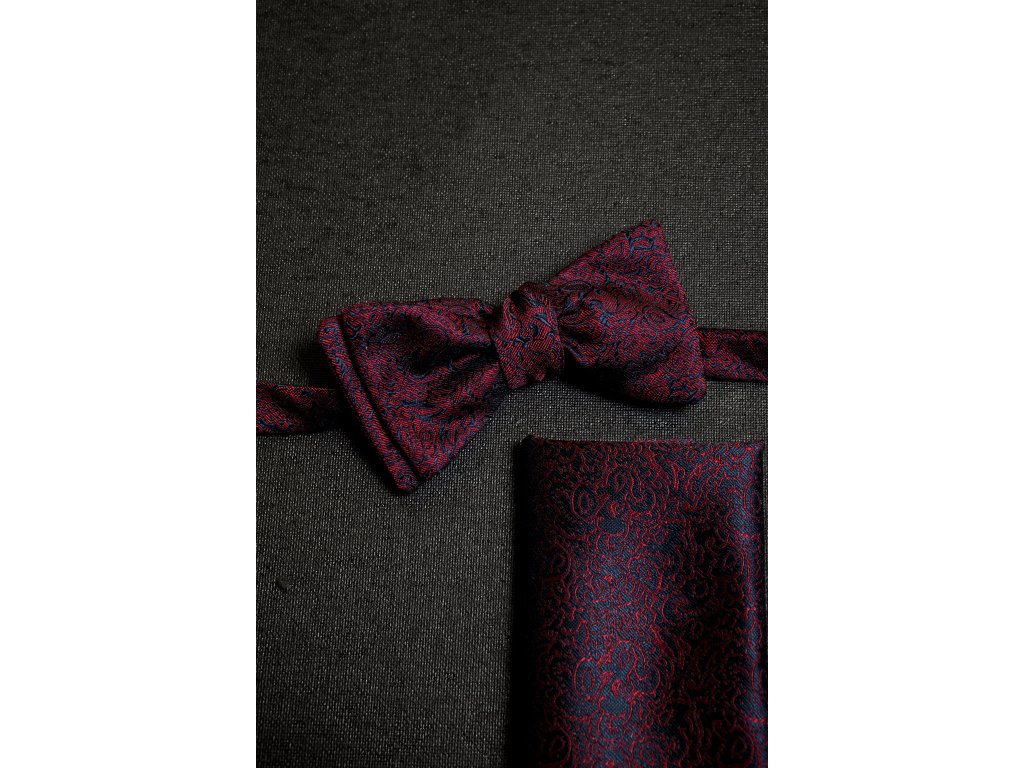 Vínový vázací pánský motýlek se vzorem + kapesníček do saka